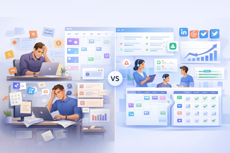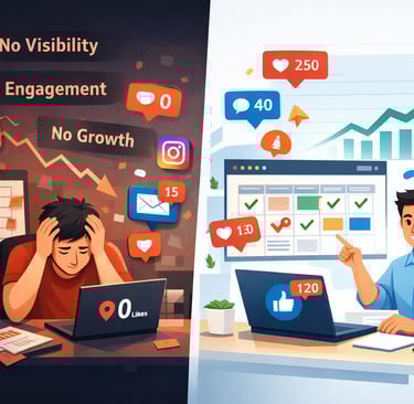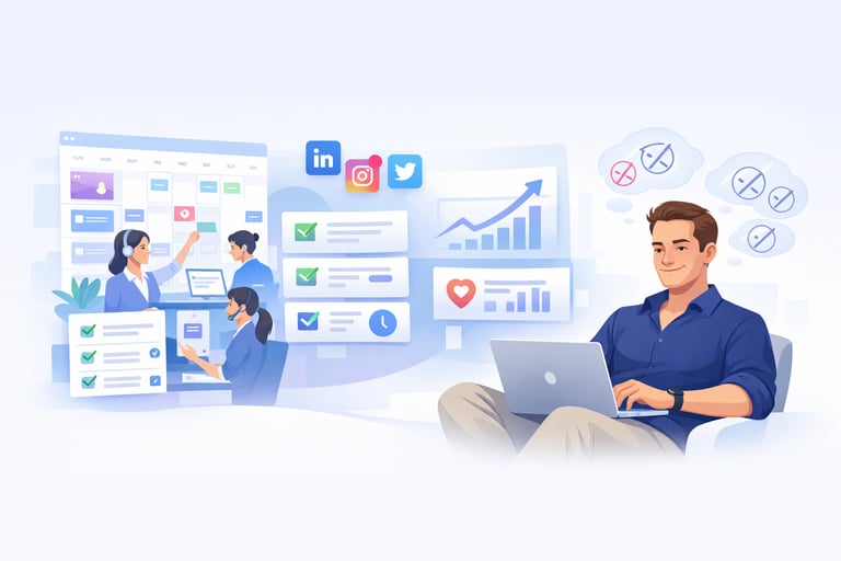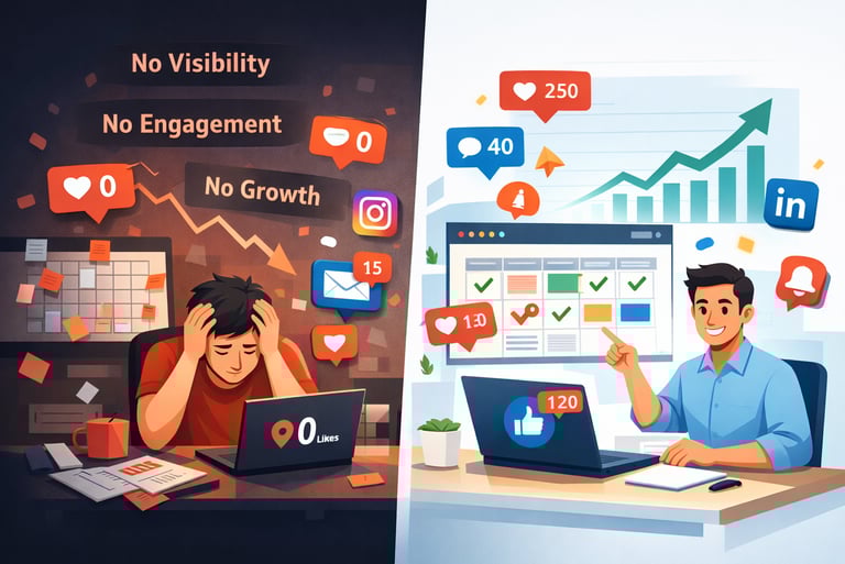 We help B2B founders and growing businesses plan, create, and manage social media. So you stay visible, relevant, and consistent without doing it yourself.